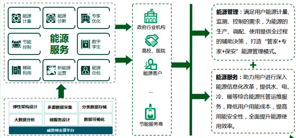 智慧能源管理及服务云平台,以“互联网+能源管理”为发展方向,基于物联网、大数据、云存储等技术,满足用户能源计量自动化、能源监控运维等需求,构建面向高校、企业、公共机构、节能服务商及政府节能主管部门的能源管理云服务中心,与企业生产制造、工艺流程相关的能耗数据紧密结合,实现远程、智能监测、治理与控制。